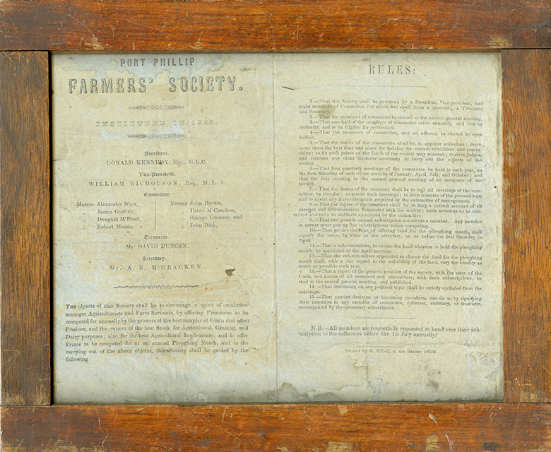 Source: A closer look at the rules published by the Port Phillip Farmers’ Society in 1848, including Hon. Donald Kennedy's name on the front. Melbourne Royal Heritage Collection.